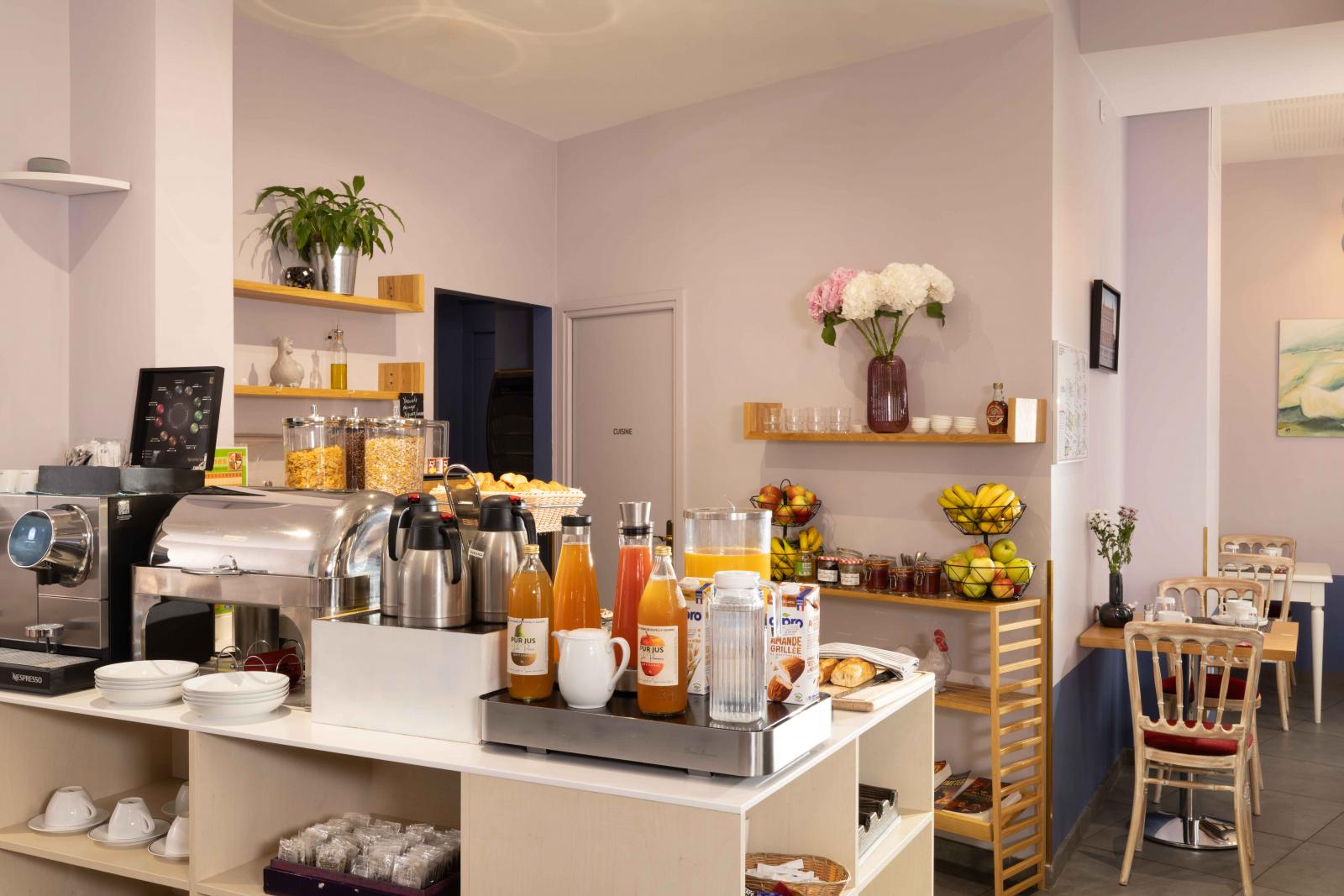 パリのホテルとしては珍しく、朝食室は0階(日本式では1階)にあり、天井の高い広々とした空間でご朝食を召し上がっていただけます。また、朝食室にはマチュラン通りに面した窓を通して日の光が降り注いでいますが、こうした日当たりの良さも、パリ中心部のホテルにはなかなかない環境です。ご朝食時間は7時から10時まで(日曜・祭日は10時半まで)で、あたたかいお料理と冷たいお料理のビュッフェをご用意しています。チーズ、ハム・ソーセージ、各種シリアル、ソフトケーキ、さまざまな味のジャム、そして幅広い種類のパンとペストリーをお楽しみください。もちろん、温かいお飲み物と冷たいお飲み物もいろいろとご用意しています。複数の種類のジュース、Baronny’sのさまざまな種類のティーのなかからご自由に選んでいただき、朝のエスプレッソが欠かせない方にはネスプレッソのコーヒーメーカーもご利用いただけます。出来立てのスクランブルエッグやオムレツをご希望の場合は、ご注文いただければミニ・シポラタソーセージ(あらびき生ソーセージ)とスモークベーコンを添えてお出しします。また、お仕事や観光にお出かけの前にビタミンをたっぷりと取っておきたい方のために、季節のフルーツもございます